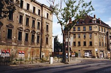 Bausubstanz (Foto: Tharandter Straße / Ecke Schillingstraße), was zu Abrissen von Gebäuden an der Kesselsdorfer Straße und am Ebertplatz führte.